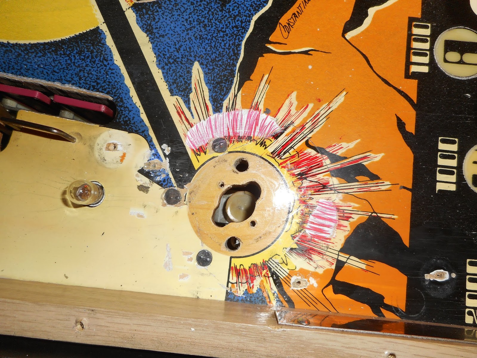 Here you can see quite a bit. There is the touch up to the pop bumper circles, blue touch up, ad space ship touch up.